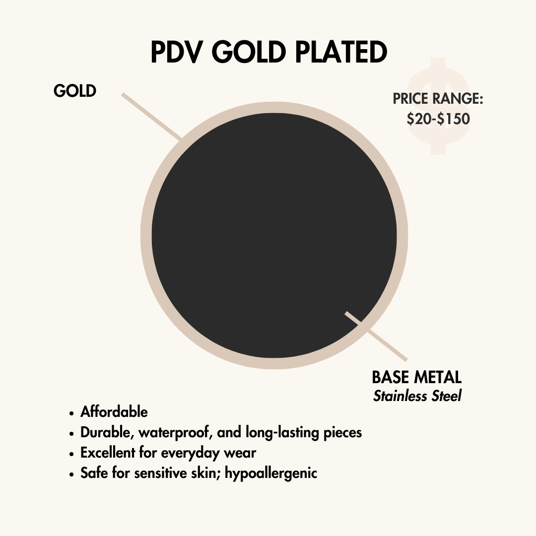 Gold plated here indicates the piece has a gold-colored surface layer applied over a base metal. With PVD the “plating” is achieved through a high-tech vapor deposition rather than simple electroplating.